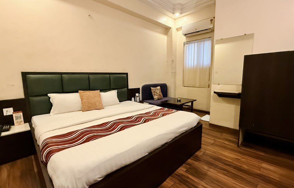 The Deluxe Ac Rooms focus on comfort through thoughtful spacing and usability. The bed is positioned to allow easy movement around the room, supported by side tables that are practical for personal items. A writing or dressing surface provides utility for work or daily routines, while seating is arranged to feel natural rather than crowded. This type of hotel room with air conditioning is ideal for guests who need a calm environment after navigating busy city roads. Travelers often search for keywords such as deluxe ac room in Indore, hotel room with AC near me, or affordable ac rooms in Madhya Pradesh, and this category fits those needs without overstating features.